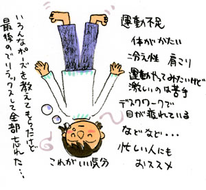 ・秋から冬にかけビリーやった。今はもうあきたけど、最初の1、2週間で血行がよくなり腰痛がなくなって、1ケ月くらい過ぎた頃から少しずつ体重が落ちた。3ヶ月で4〜5kgくらいだけど筋力もつくので体感では倍くらい身が軽くなったよ。
